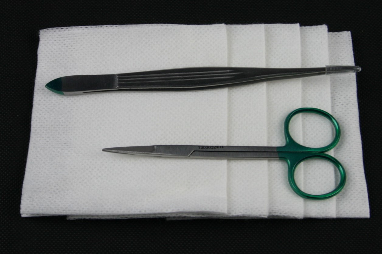 Set di strumentario monouso in acciaio inossidabile Medica Europe contenente: 1 Forbice Iris diritta cm11 1 Pinza anatomica Mcindoie cm15 5 Garze in TNT a 4 strati cm 10×10